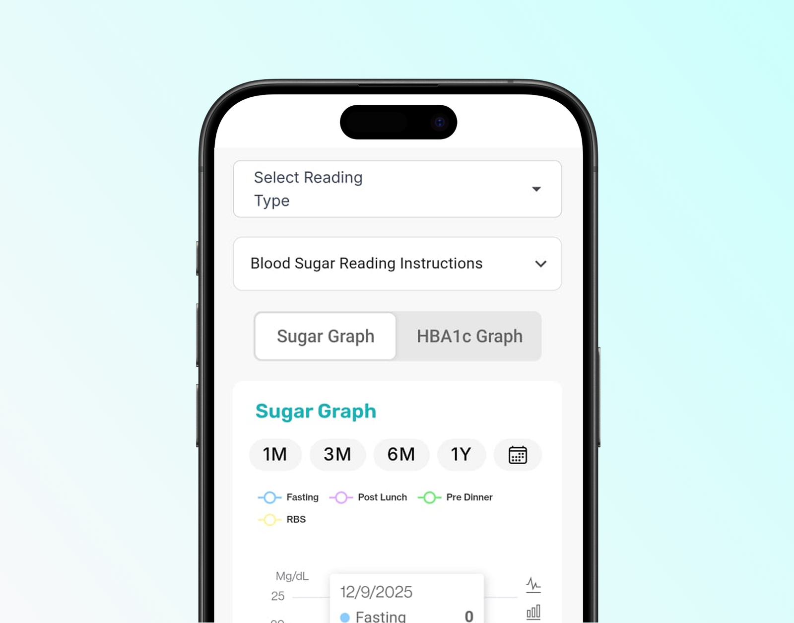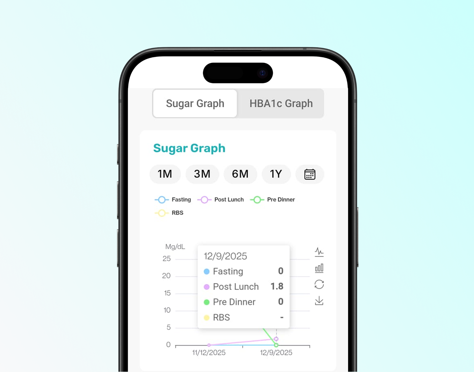 Manage sugar in 60 seconds. Track readings, get reminders, and share live updates with your doctor & family — all in one app.